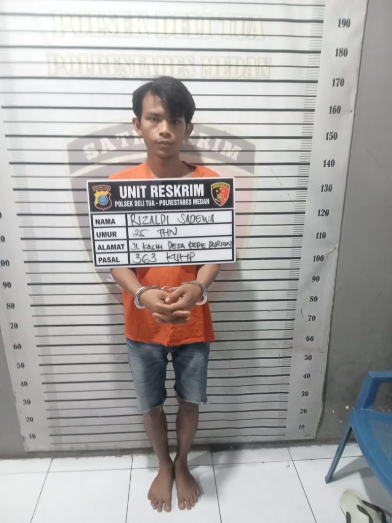 Pelaku yang diketahui bernama Rizaldi Sadewa alias Dewa (25), warga Jalan Kasih, Desa Kede Durian, Kecamatan Delitua, berhasil di amankan dan kemudian diringkus pada Selasa (13/5/2025) sekitar pukul 20.00 WIB di sebuah Alfamart di Jalan Besar Delitua, Desa Mekar Sari, Kecamatan Delitua.