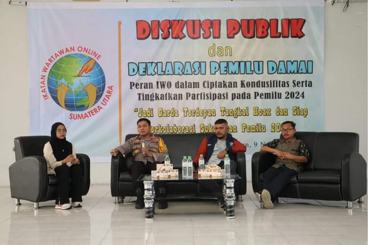 Hal tersebut disampaikan Kapolda Sumut yang diwakili Kabid Humas Poldasu, Kombes Pol Hadi Wahyudi SIK SH di acara Diskusi Publik dan Deklarasi Pemilu Damai Tahun 2024 yang diselenggarakan Pengurus Wilayah Ikatan Wartawan Online (PW IWO) Sumatera Utara, Kamis (9/11/2023) di Gedung H Anif UIN SU Medan.