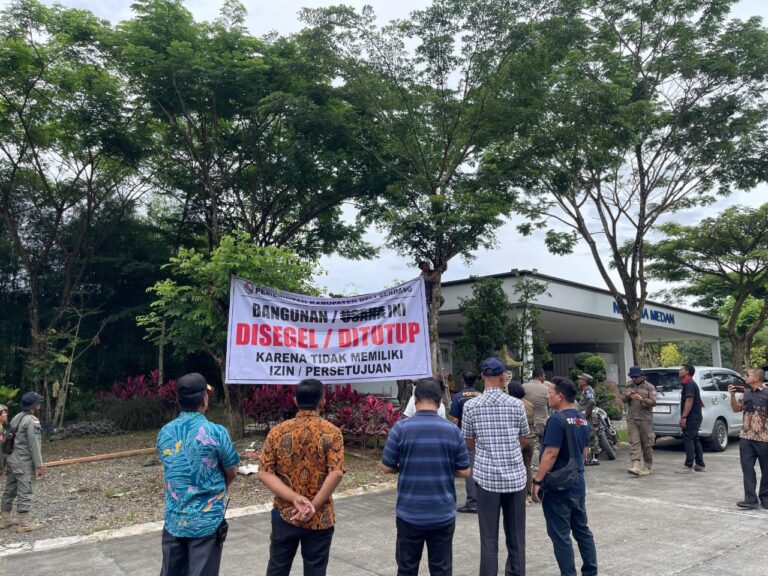SIBOLANGIT – Satuan Polisi Pamong Praja (Satpol PP) Deliserdang menyegel bangunan gedung PT. Nirvana Memorial Nusantara (NMN) yang berada di Desa Bingkawan Kecamatan Sibolangit, Jumat (11/4/25).