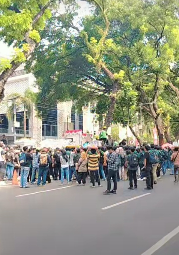 Jumlah massa diperkirakan ratusan orang dengan properti spanduk, poster, dan juga mikrofon.