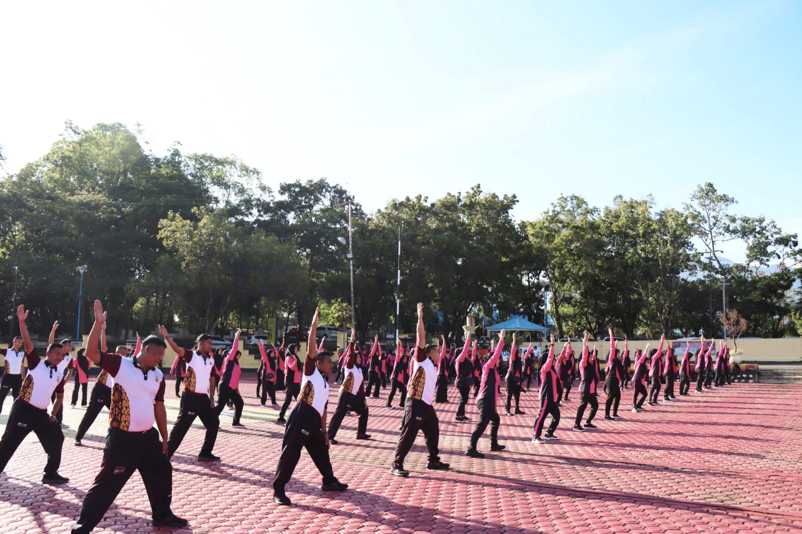 Kegiatan olahraga bersama yang diawali dengan pemanasan kemudian dilanjutkan dengan senam bersama di pimpin oleh Instruktur Senam bertempat di lapangan Apel Polres Aceh Besar.
