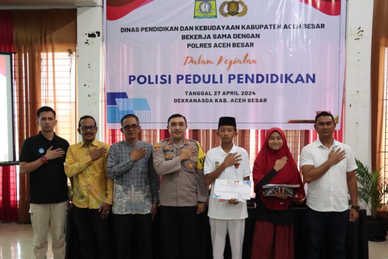 ACEH BESAR – Dalam upaya mewujudkan generasi bebas narkoba dan tertib berlalu lintas serta mengatasi kenakalan remaja, Polres Aceh Besar dan Pemerintah Kabupaten Aceh Besar melalui Dinas Pendidikan dan Kebudayaan (Disdikbud) Kabupaten Aceh Besar melaksanakan Program Sosialisasi Polisi Peduli Pendidikan yang dilaksanakan di Aula Dekranasda Aceh Besar Gampong Gani Kecamatan Ingin Jaya, Sabtu (27/4/2024).