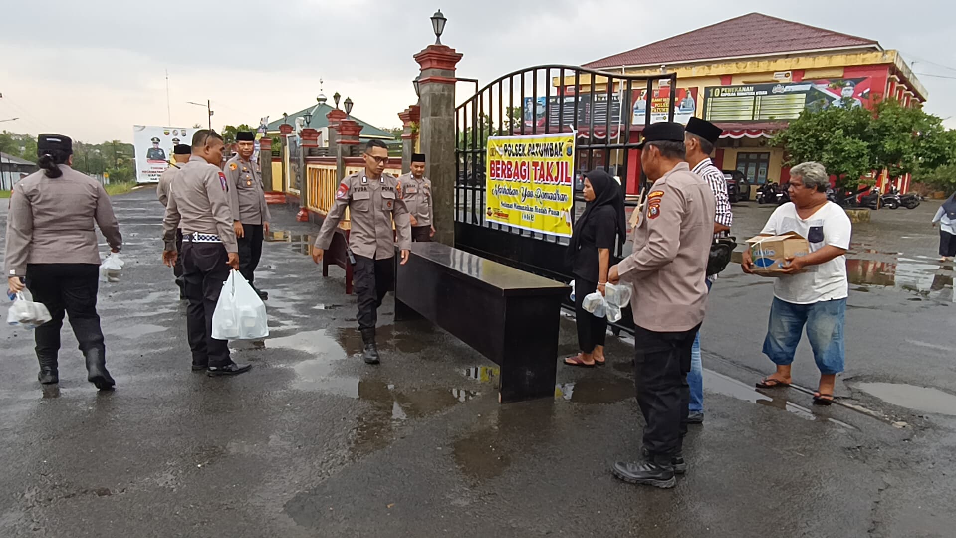 Meskipun sedang di guyur hujan, tidak menyurutkan niat Kapolsek Patumbak dan Kanit Intel, Kanit Reskrim, Kanit Lantas, Panit I Ipda Eko Priya SH serta Kanit Patroli Ipda Rezeky Tua Pandiangan bersama personel Polsek Patumbak membagi – bagikan makanan takjil buka puasa secara gratis kepada warga masyarakat Kec.Patumbak yang sedang melintas di jalan raya tepatnya di depan Mako Polsek Patumbak pada hari Jumat (7/3) sore menjelang buka puasa.