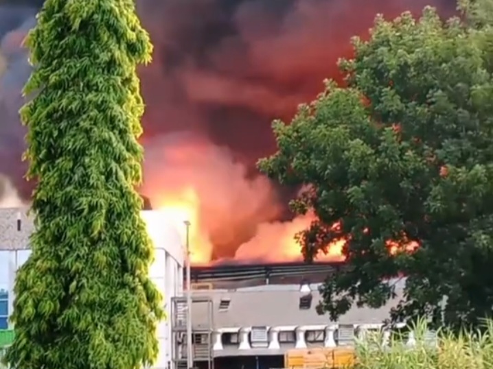 Kepulan asap tebal disusul kobaran api muncul dari lokasi pabrik yang memproduksi turunan minyak sawit seperti minyak goreng, margarin dan shortening.