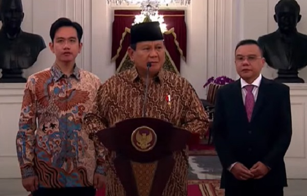 Didampingi Gibran dan Ketua Harian Partai Gerindra Sufmi Dasco Ahmad, Prabowo memberikan pengumuman kepada awak media yang hadir. Berikut susunan Kabinet Merah Putih: