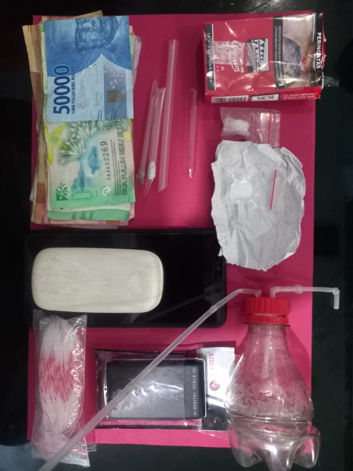 Dari tersangka YP, lanjutnya, diamankan barang bukti berupa, 2 plastik klip transparan berukuran sedang berisi diduga sabu yang setelah ditimbang seberat 2,59 gram, 1 plastik klip transparan kecil berisi diduga sabu, uang tunai Rp.455.000 diduga hasil penjualan sabu, 3 unit handphone, 1 unit timbangan elektronik, 3 pipet plastik bertbentuk sekop, 1 kaca pirex, 1 bal plastik klip kosong, 1 karen kompeng, dan 1 mancis.