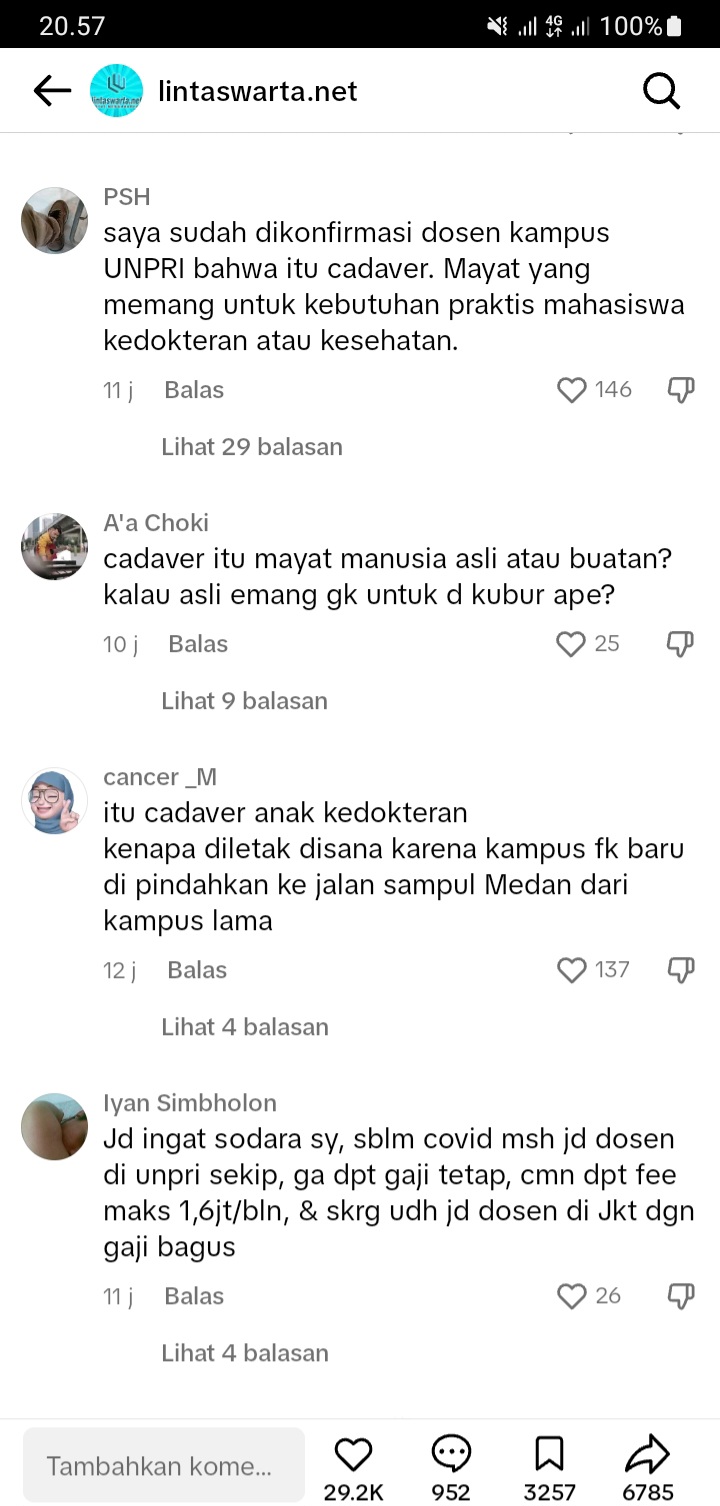 “Itu kadaver anak kedokteran kenapa diletak disana karna fk kampus baru dipindahkan ke jalan sampul medan dari kampus lama.” tulis akun @cancer_m.