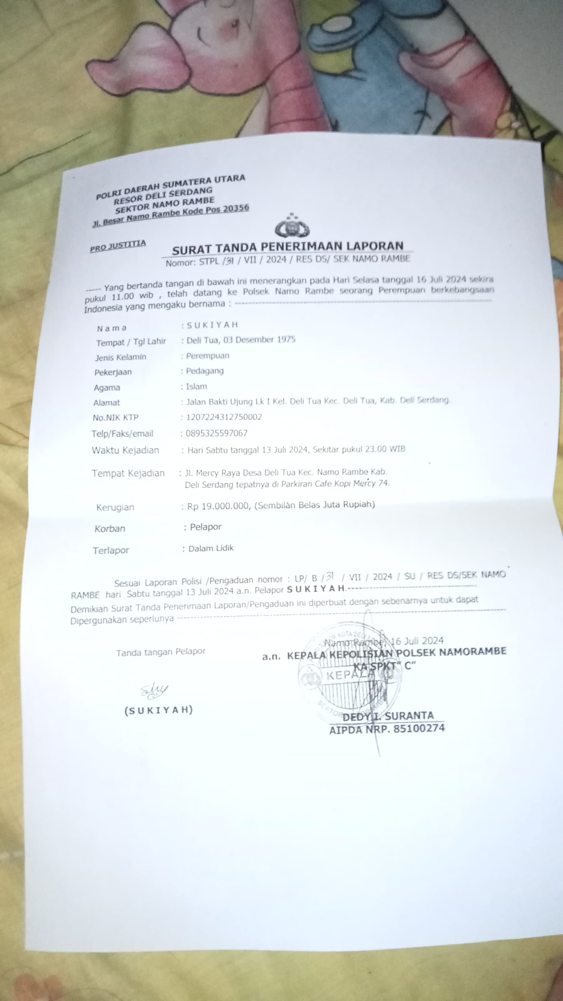 Atas kejadian tersebut, korban (Sukiyah) telah melaporkan hal tersebut ke Polsek Namorambe dengan Nomor STPL/31/VII/2024/RES DS/SEK NAMORAMBE. Kerugian ditaksir Rp.19.000.0000,
