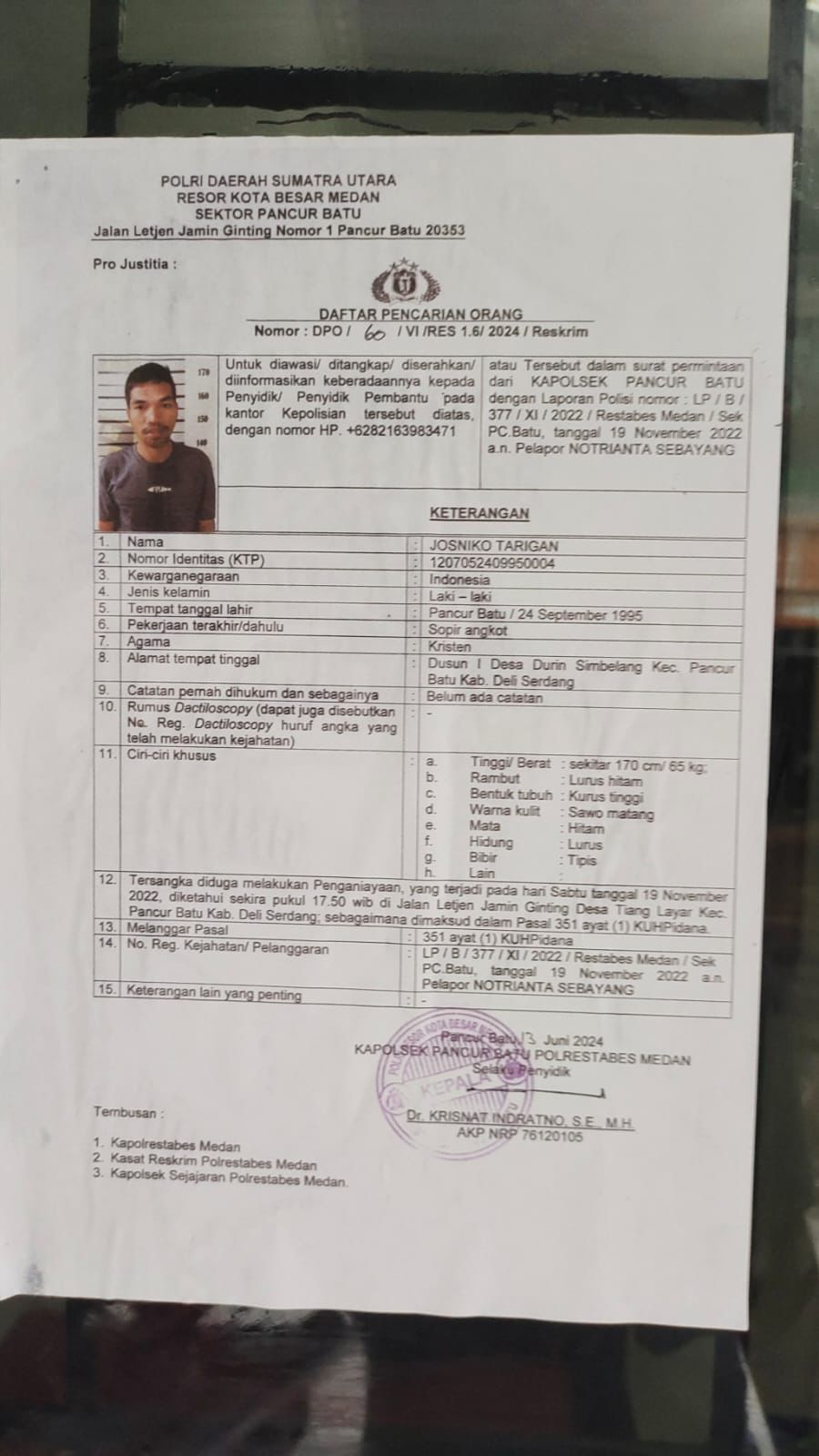Polsek Pancur Batu resmi merilis tersangka penganiyayaan Josniko Tarigan masih DPO Polsek Pancur Batu, Rabu (19/6). Dalam surat DPO itu, masyarakat diminta membantu pihak kepolisian untuk meringkus tersangka penganiyayaan tersebut.