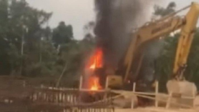 Dari kabar yang viral di media sosial, api terlihat berkobar-kobar menjilat body eksavator. Tak terlihat satu buruh pun berada di tempat itu.
