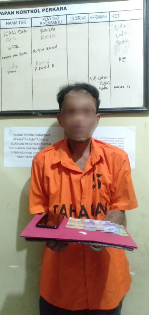 Selanjutnya, dilakukan penggeledahan terhadap tersangka dan ditemukan barang bukti berupa 1 bungkus kecil sabu, uang tunai Rp. 65.000,- dan 1 Handphone Android merek VIVO warna biru gelap.