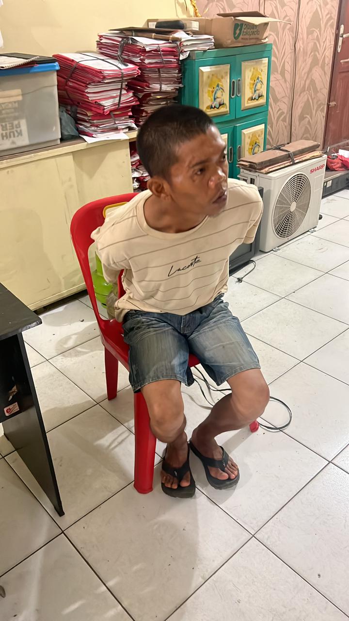 Malam harinya, sekira pukul 21.30 WIB, petugas mendapat info kalau tersangka berada di kawasan Delitua Gang. Kolam. Tanpan buang waktu lagi, petugas langsung bergegas menuju ke lokasi yang disebutkan, dan akhirnya berhasil meringkus tersangka yang sedang tertidur di teras rumah warga.