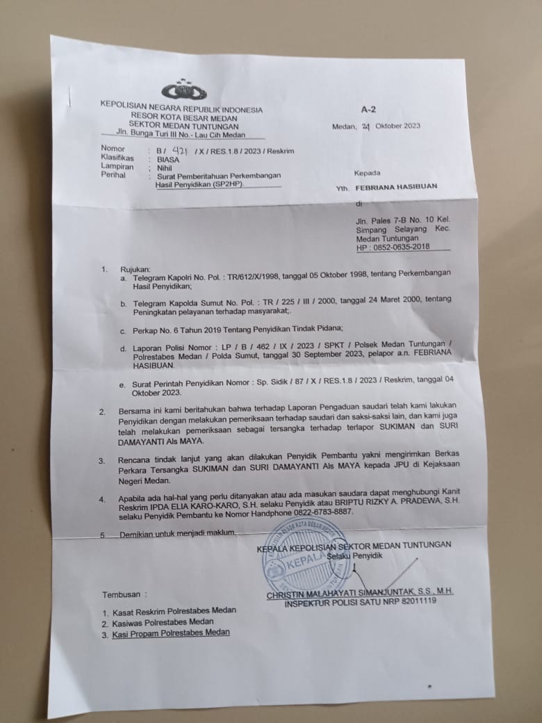 “Sudah kami terima pak SP2HP dari penyidik Polsek Medan Tuntungan, semoga kasus ini segera selesai. Surat itu tertulis tanggal 24 Oktober 2023 kemarin,”kata korban, Febriana Hasibuan (55) warga Jalan Pales 7 B Nomor 10 Simpang Selayang Medan Tuntungan kepada wartawan, Kamis (25/10).