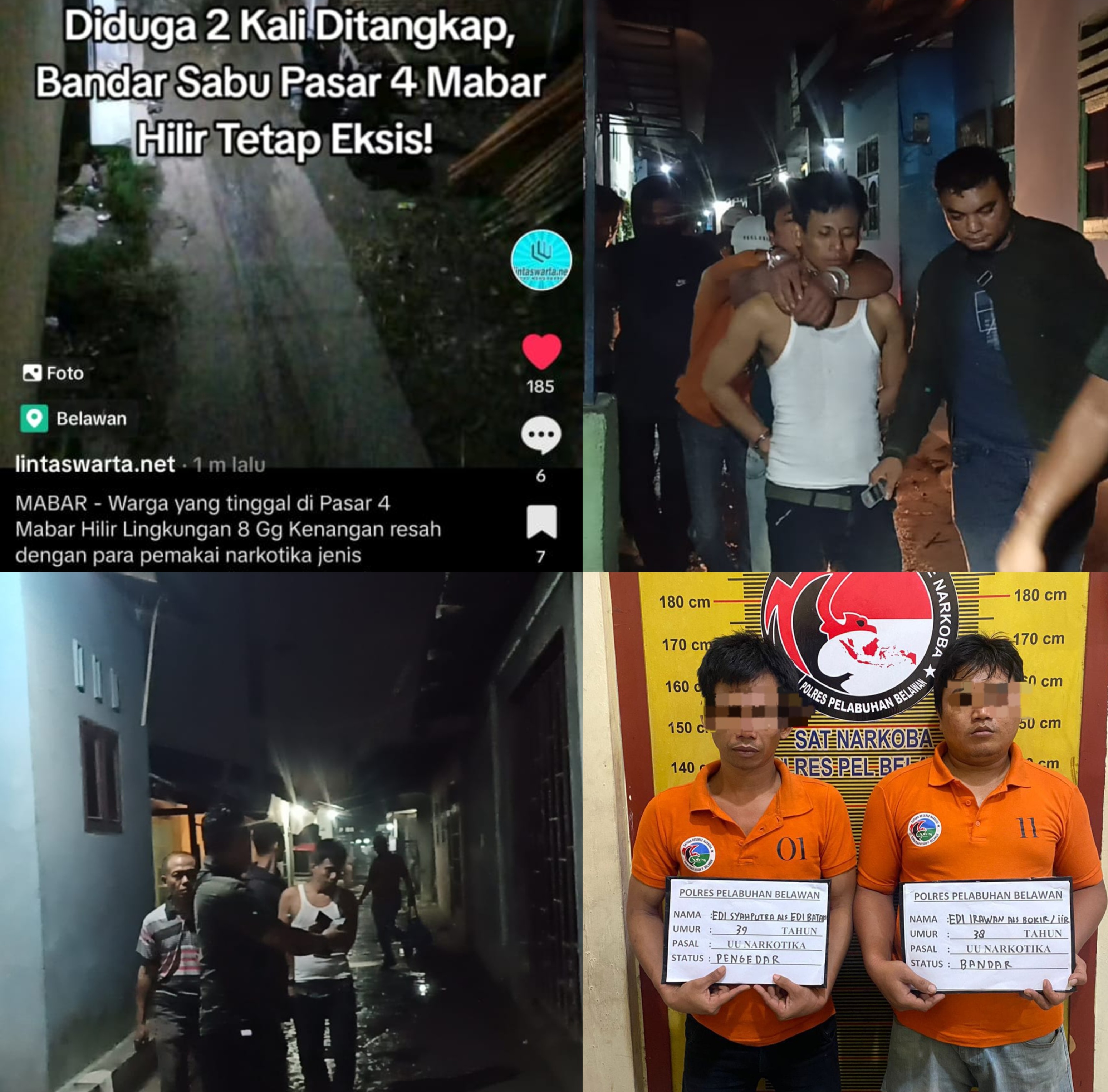 Kapolres Pelabuhan Belabuhan melalui Kasat Narkoba Polres Pelabuhan Belawan AKP Muhammad Abdi Harahap SH menjelaskan penangkapan tersangka berawal pengaduan dari Masyarakat (Dumas, red) melalui sosial media (Sosmed) di Tik-Tok dan berita Media Online lintaswarta.net maraknya transaksi narkotika jenis sabu di Jalan Suasa Tengah Pasar 4 Gg Kenangan dan Gg Said Kel. Mabar Hilir Kec. Medan Deli.
