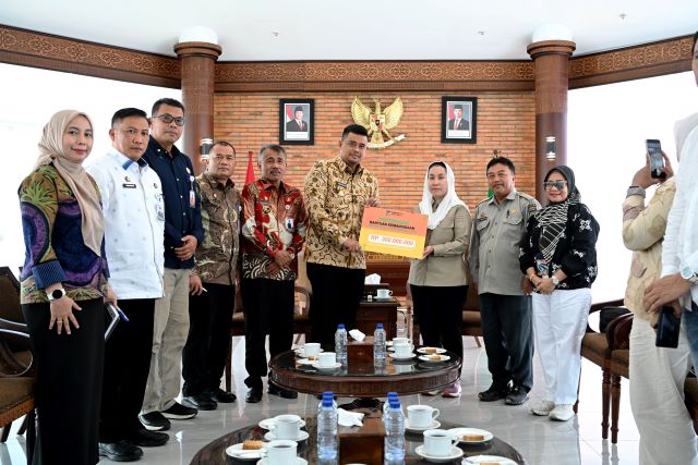 Bobby Nasution terima donasi dari masyarakat Palu itu diserahkan langsung Wakil Wali Kota Palu, Imelda Liliana Muhidin, di Kantor Gubernur Sumut, Jalan Diponegoro Medan, Kamis (11/12/2025).