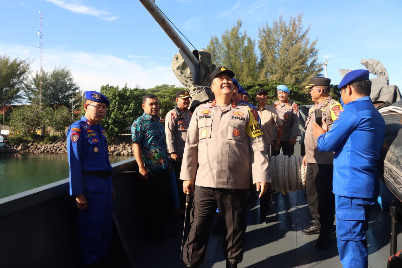 BANDA ACEH – Kapolda Aceh Irjen Achmad Kartiko mengecek kapal patroli Antareja 7007 bawah kendali operasi (BKO) Baharkam Mabes Polri di Pelabuhan Ulee Lheue, Kota Banda Aceh.