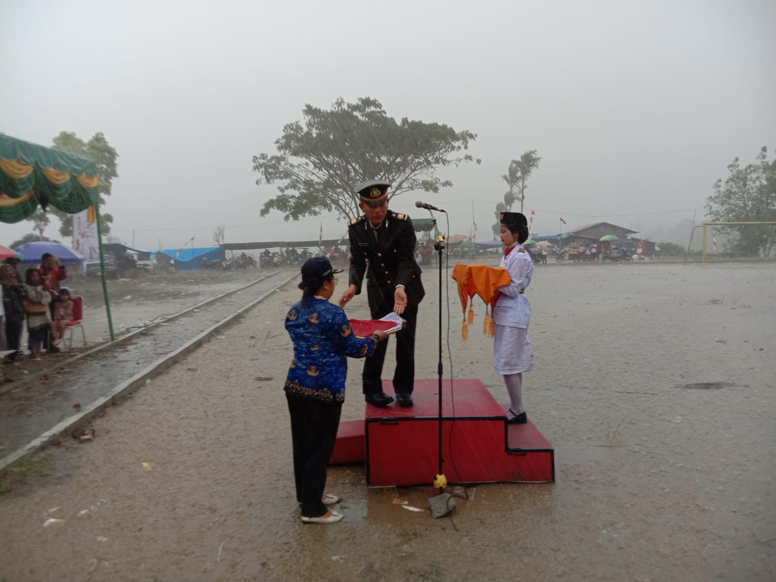 Di tengah guyuran hujan Paskibra Kecamatan Salak berhasil menurunkan Sang Saka Merah Putih dan merapikan kedalam Wadah yang telah di persiapkan panitia acara.