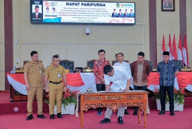 DPRD dan Pemkot Medan setujui revisi Perda Penyelenggaraan Ketenagakerjaan pada sidang paripurna DPRD Kota Medan, Senin (9/9/2024). Persetujuan di tandai dengan penandatanganan naskah persetujuan oleh pimpinan DPRD Kota Medan bersama Wali Kota Medan.