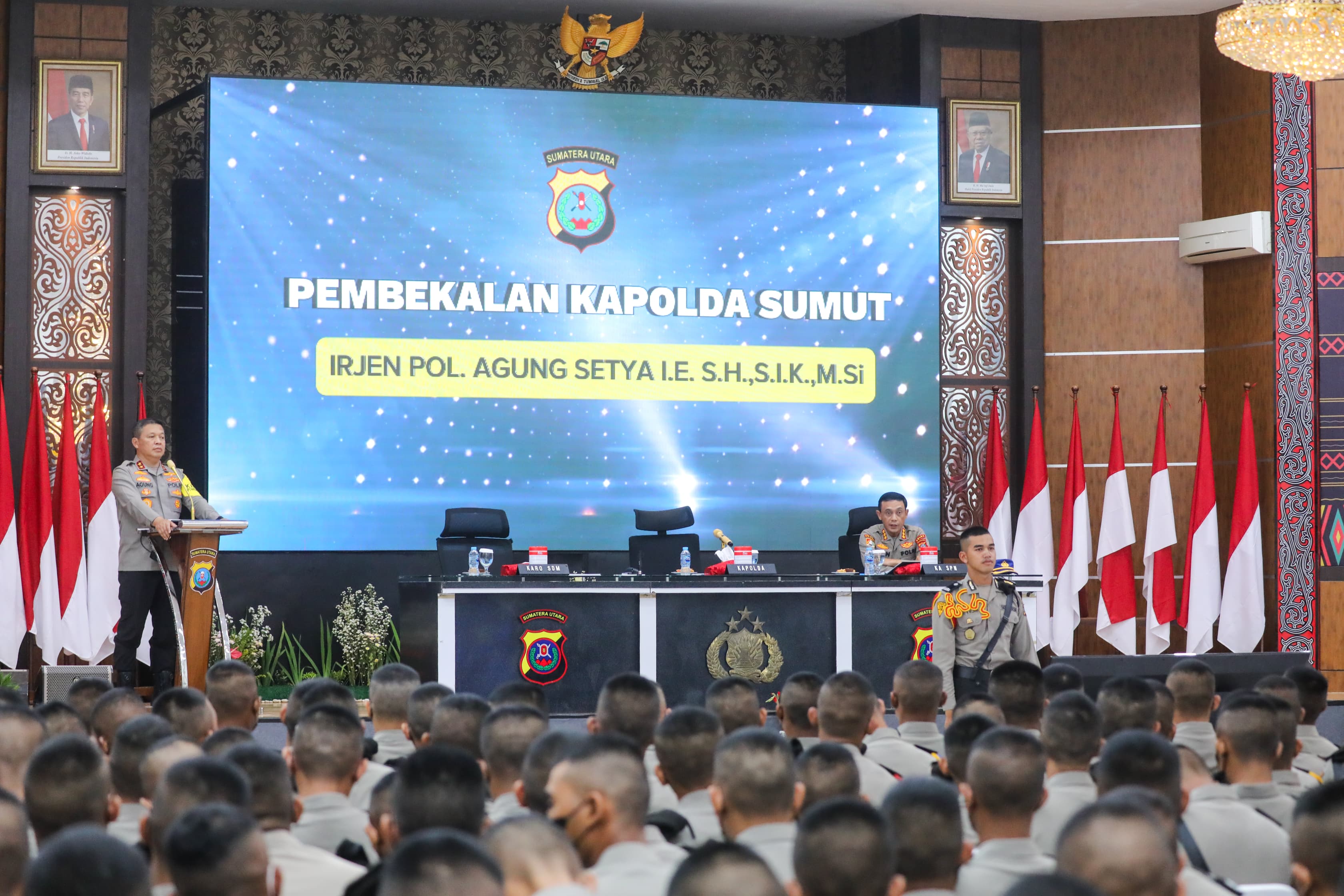 MEDAN – Kapolda Sumut, Irjen Pol Agung Setya Imam Effendi, memberikan pembekalan kepada 441 Siswa Diktuk Bintara Polri Gelombang ll Angkatan 49 Tahun Anggaran 2023 di Aula Tribrata Mapoldasu, Senin (18/12).