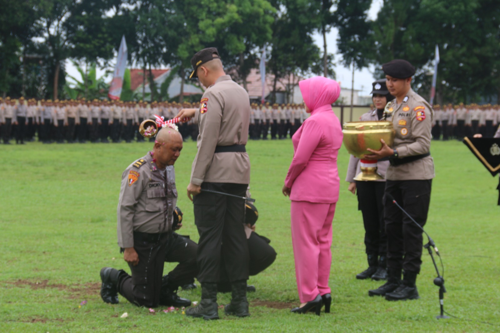 Diakhir upacara, dilaksanakan prosesi pembinaan tradisi lembaga pendidikan, yang secara simbolik ditandai dengan penyiraman air bunga oleh Kasetukpa beserta ibu Ketua Bhayangkari Cabang 04 Setukpa Ny. Tasha Mardiaz kepada dua orang perwakilan siswa PAG dari bintara ke perwira gelombang II tahun 2023.