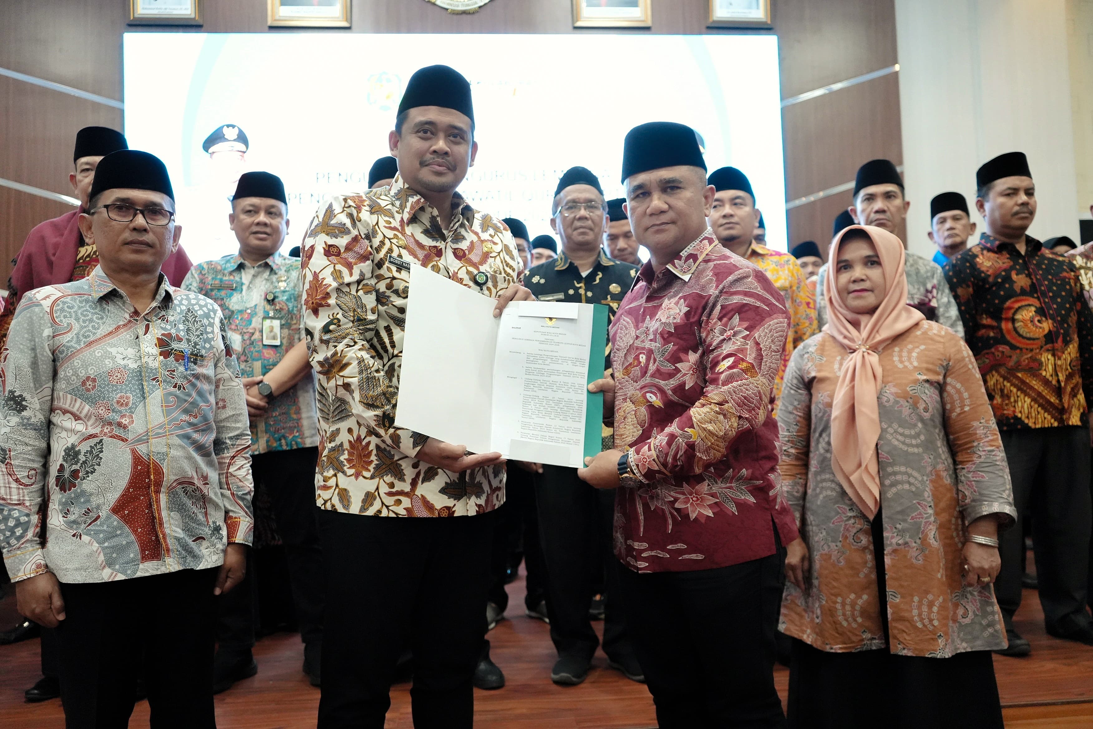 MEDAN – Wali Kota Medan, Bobby Nasution mengukuhkan pengurus Lembaga Pengembangan Tilawatil Qur’an (LPTQ) Kota Medan periode 2024-2028 di Balai Kota, Kamis (22/8).