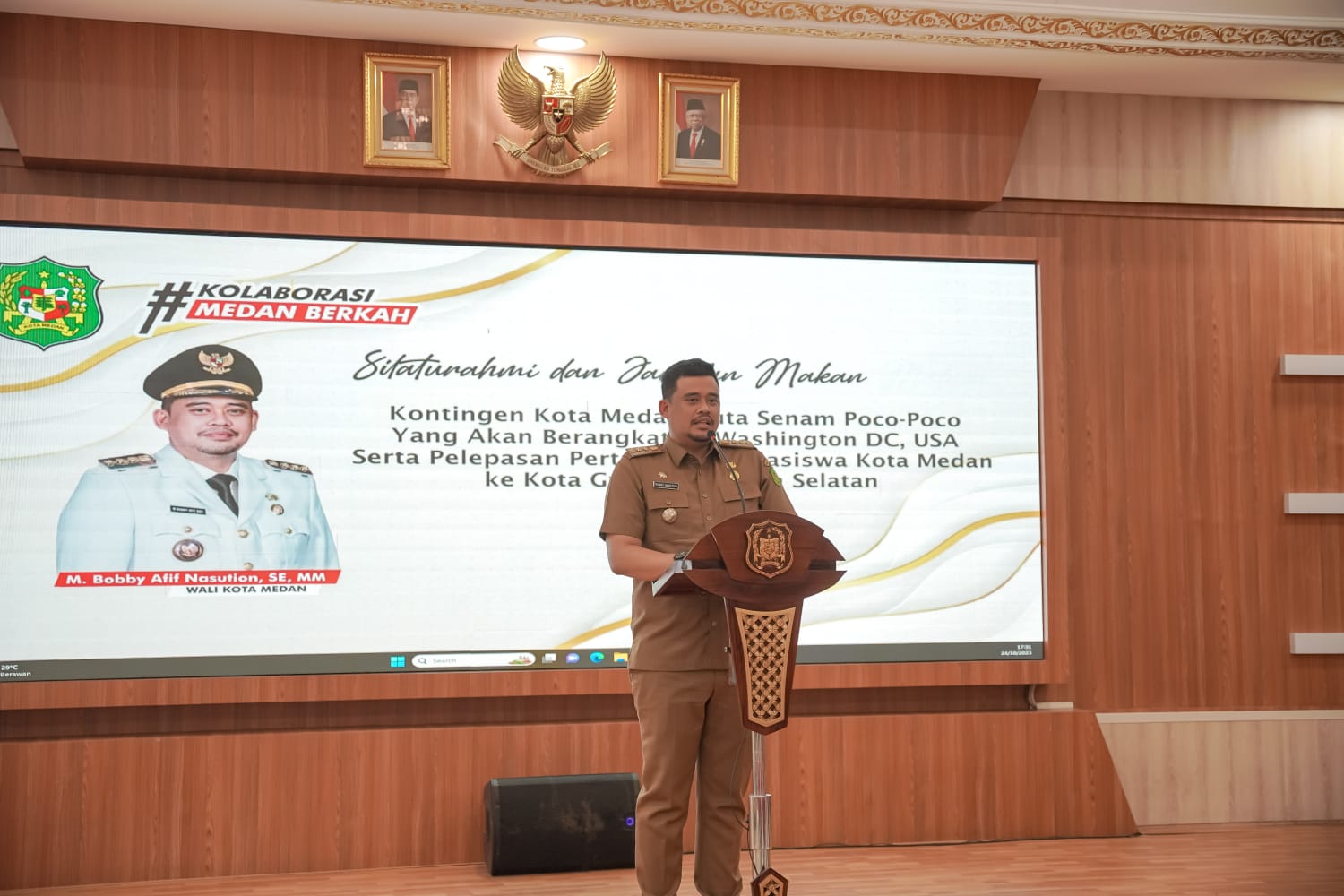 MEDAN – Perkenalkan Kota Medan dan jaga diri dengan baik menjadi pesan yang disampaikan Wali Kota Medan Bobby Nasution saat bersilaturahmi sekaligus jamuan makan dengan Kontingen Kota Medan Duta Senam Poco-Poco yang akan berangkat ke Washington DC, Amerika Serikat (AS) serta Pelepasan Pertukaran Mahasiswa Kota Medan ke Kota Gwangju, Korea Selatan di Pendopo Rumah Dinas Wali Kota, Jalan Sudirman Medan, Selasa (24/10) petang.