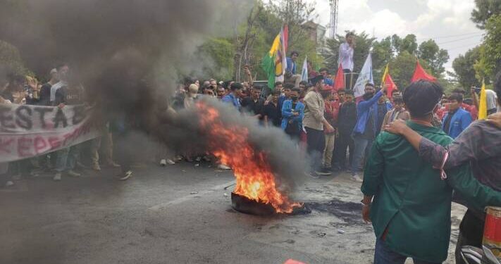 Sempat terjadi sedikit ketegangan saat petugas berusaha memadamkan ban yang dibakar para mahasiswa. Beruntung ketegangan itu tidak sampai terjadi bentrok.