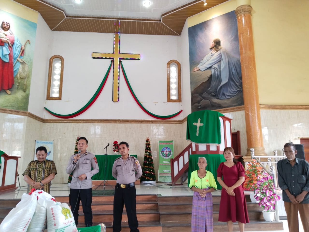 Di Gereja GKPS Desa Kotarih Pekan Kecamatan Kotarih Kabupaten Serdang Bedagai, Ipda Brimen Sihotang bersama personil Polsek dengan hikmat menunaikan ibadah Gereja, menyampaikan edukasi kamtibmas serta memberikan bahan pangan beras kepada jemaat.