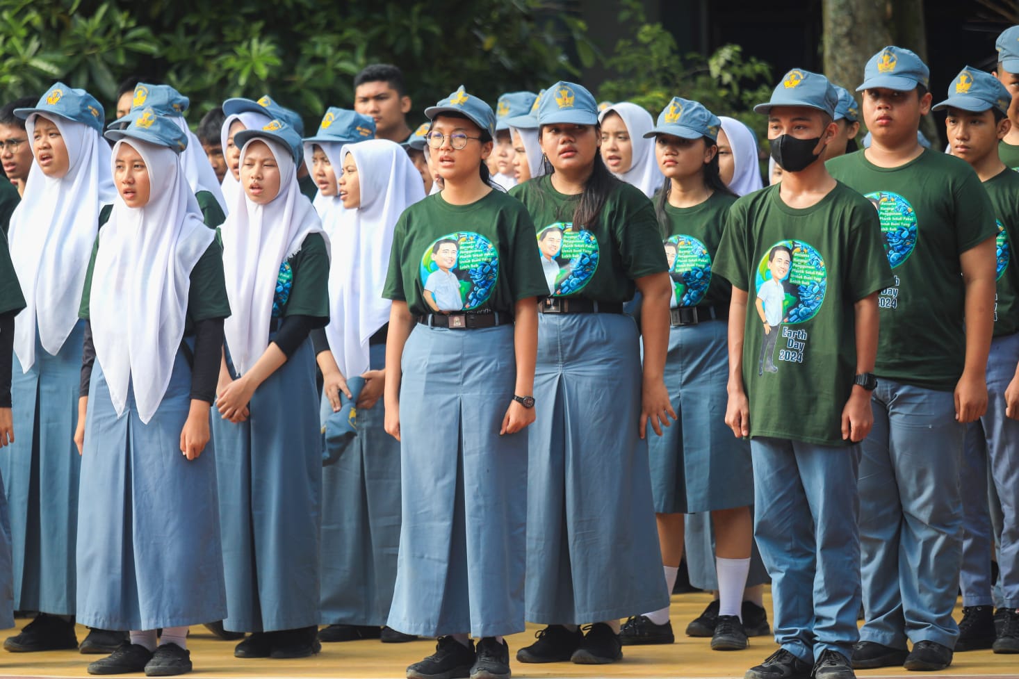 MEDAN – Sejumlah Penggiat Lingkungan kota Medan mengikuti Apel dalam rangka peringatan Hari Bumi 2024 yang digelar Pemko Medan di SMA Negeri 13 Medan, Senin (10/6/24).