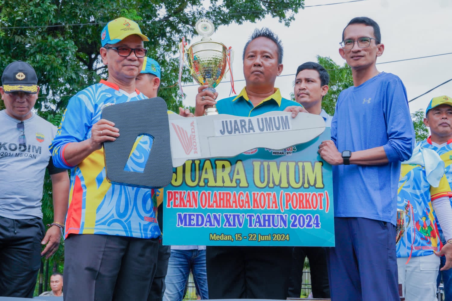 MEDAN – Wali Kota Medan Bobby Nasution diwakili Kadis Pemuda dan Olahraga (Kadispora) Kota Medan Dammikrot Harahap menutup Pekan Olahraga Kota (Porkot) Medan ke XIV tahun 2024 di Lapangan Balai Desa Jalan Beringin 2, persis samping Kantor Camat Medan Helvetia, Sabtu (22/06). Kecamatan Medan Deli berhasil keluar sebagai juara umum setelah meraih 26 medali emas, 23 perak dan 19 perunggu.
